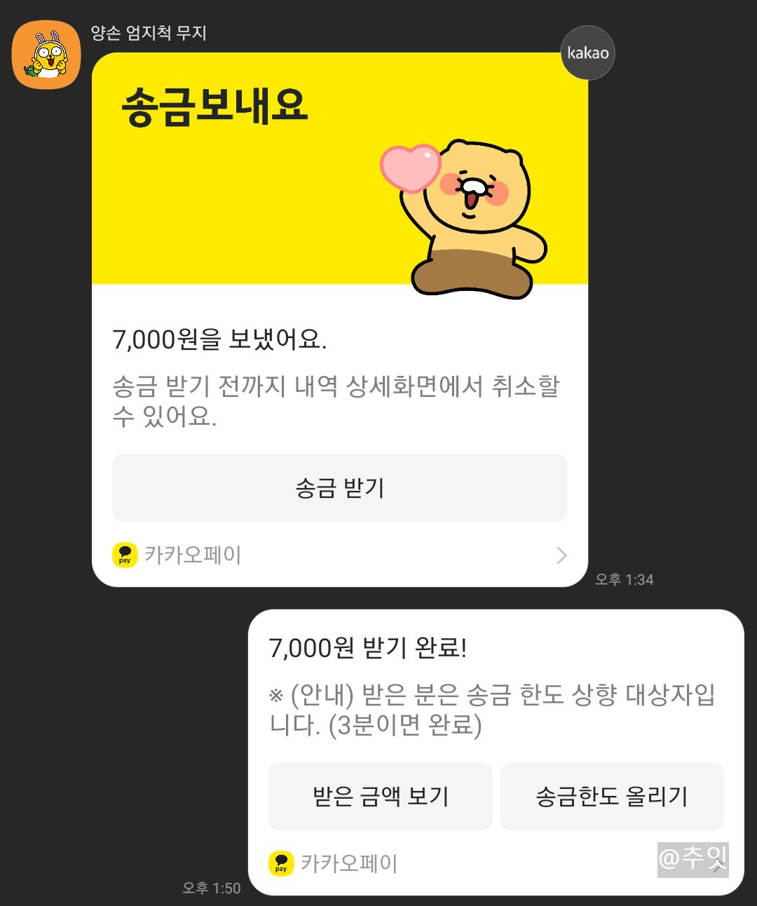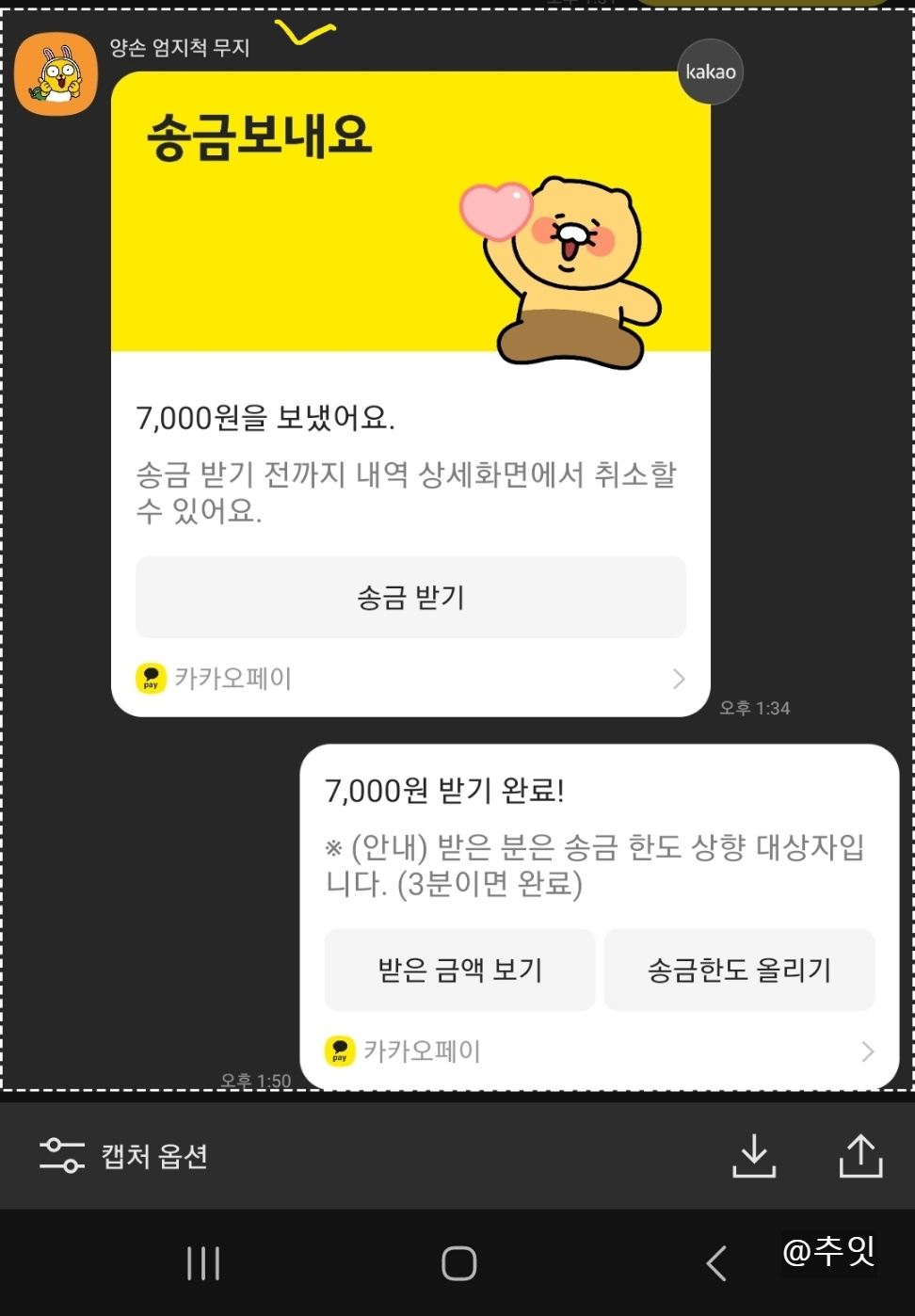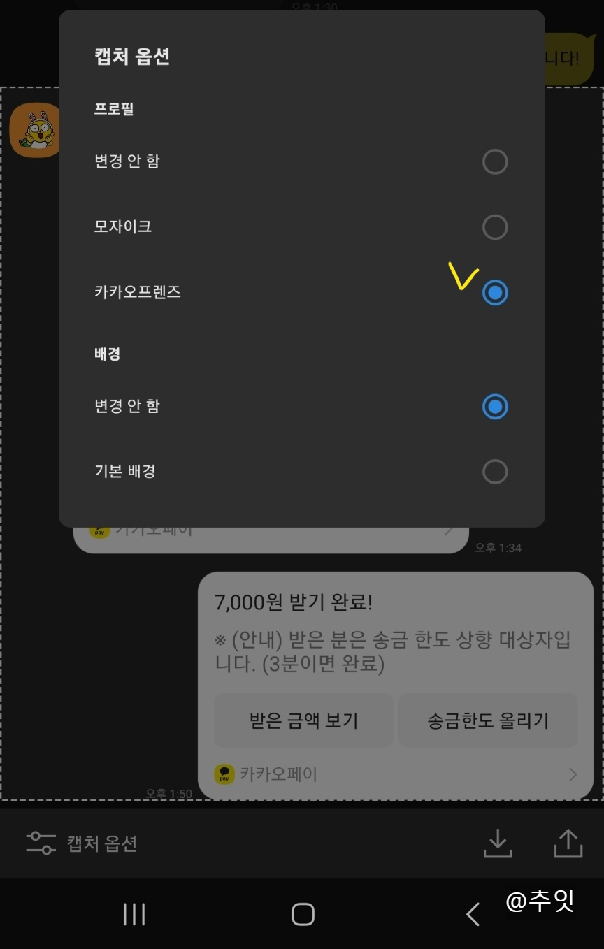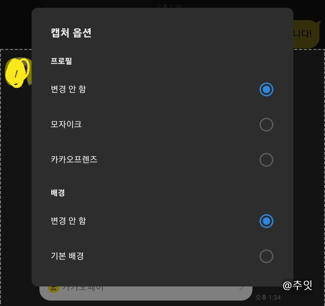 이 경우 상대방 프로필 사진과 이름이 카카오 프렌즈 중 랜덤으로 선택되어 캡처하게 됩니다.