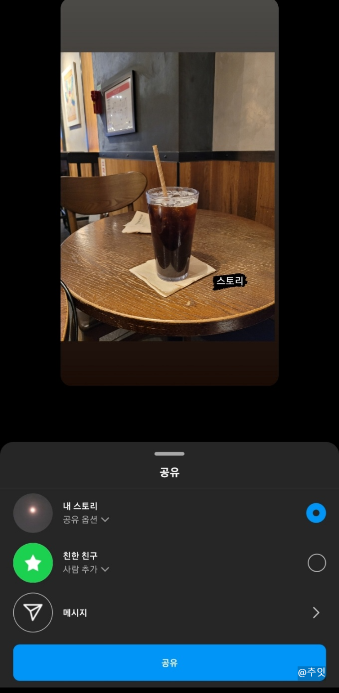 그중에서 원하는 공개 범위를 선택하고 <공유> 버튼을 누르면 인스타그램 스토리가 올라가요.