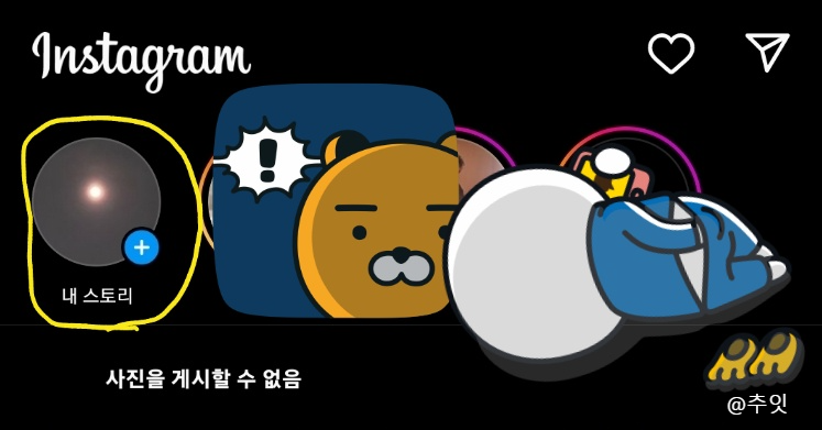좌측 상단에 보이는 내 프로필에 + 모양이 있죠? 저걸 누르면 스토리 등의 피드를 올릴 수 있게 됩니다.